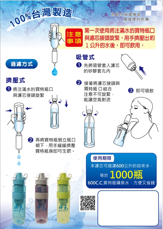 得邑 鹹性負氫濾水壺 買6送1 水素水健康飲 隨身攜帶 不需充電 耐用方便 讓身體更有活力 得邑 鹹性負氫濾水壺_美鳳有約介紹 1.全球首創攜帶式鹼性負氫濾水壺,使用美國FDA核可的頂級Tritan材質製成,耐摔耐用,不用插電。濾芯可使用600cc的容量1000次(一天飲用1800cc時則可使用333天),比買礦泉水更伐算哦! 2.結合美國、日本、台灣科技及測試認證,並獲得台灣、中國專利。 3.不含環境賀爾蒙-雙酚A(BPA)檢測合格,用的安心,喝的健康。 顏色:藍色(目前僅售此一顏色)