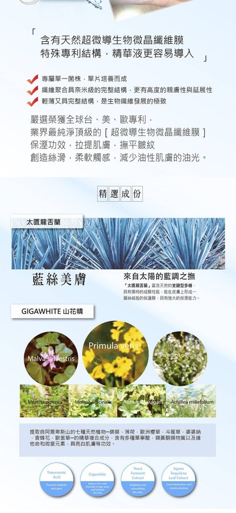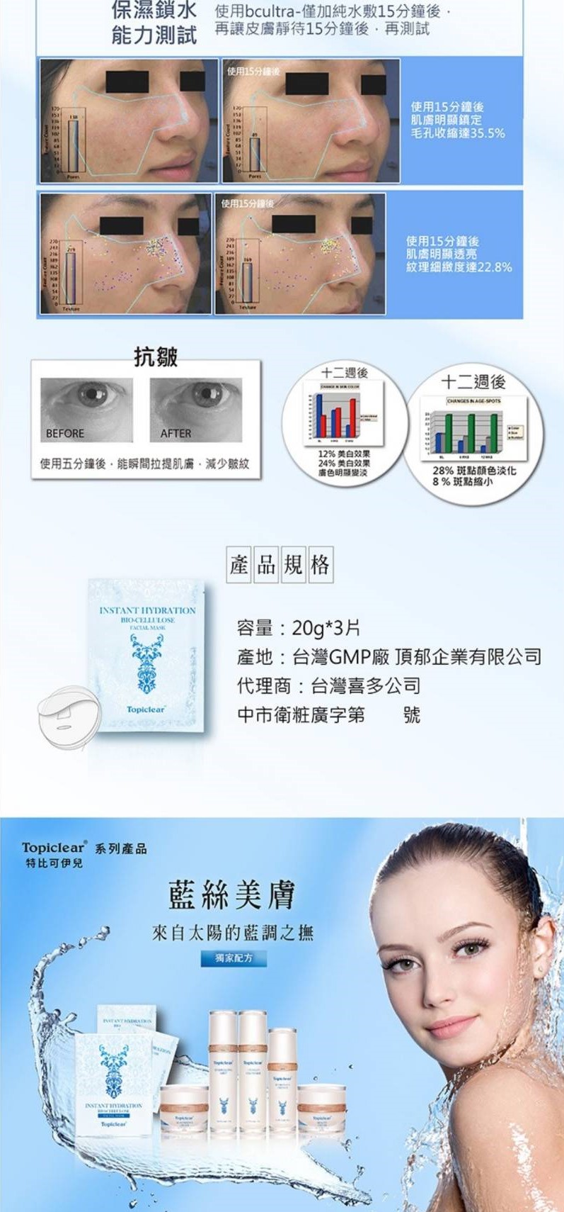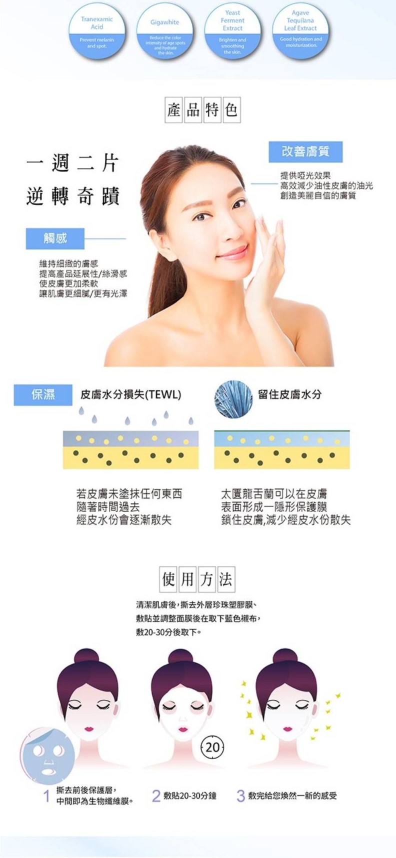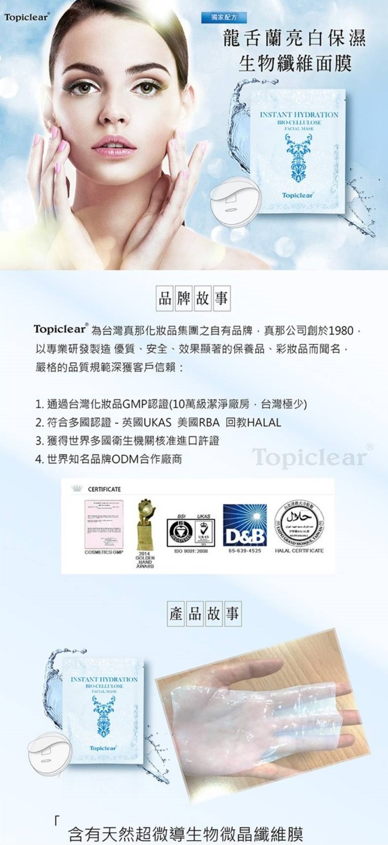 Topiclear龍舌蘭亮白保濕生物纖維面膜 可以保濕 舒緩肌膚,含有天然超微導生物微晶纖維膜 特殊專利結構讓精華液更容易導入 使用說明:本產品共有3層,生物纖維膜為中間層!潔膚後,撕去外覆珍珠膜,敷貼並調整面膜後,再取下藍色襯布,敷用20-30分取下。